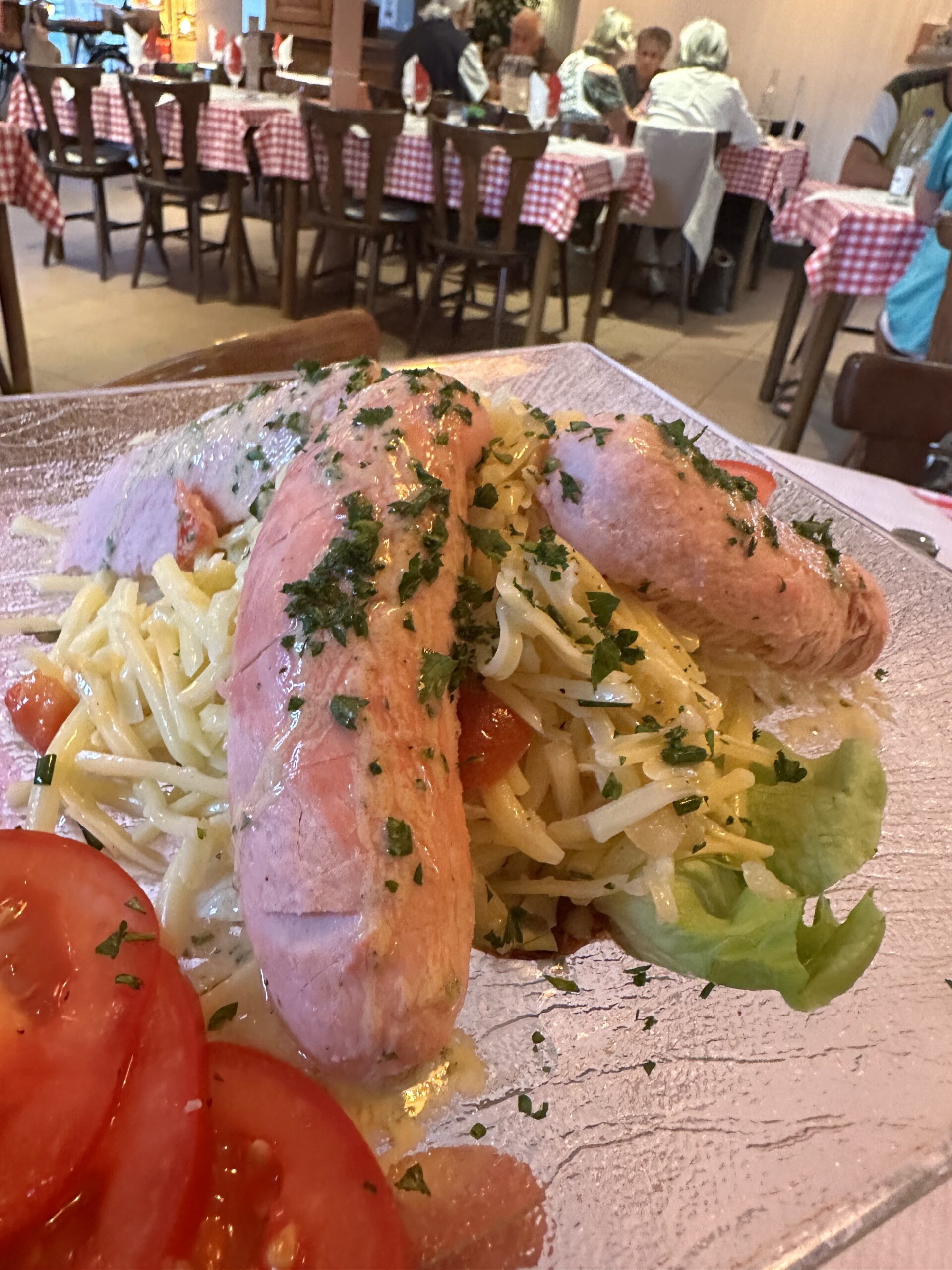 Salade mixe cervelas/gruyère, salade de foies de volaille, escalope viennoise (taillée un peu trop épaisses) flanquée de légumes du moment et de spätzle, glaces et sorbets de la voisine ferme du Limon à Bust et tartes maison (fromage blanc) ou encore clafoutis aux cerise complètent l’offre maison. A la pression, la bière Unik de la brasserie de Saverne fait du bien par où elle passe.