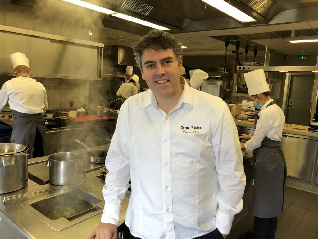 Il est l’homme des hauteurs, le deux étoiles de Chaudes Aigues, installé depuis une décennie dans le château de Couffour, avec ses armatures de fer oxydé, son béton, ses salles magiques et panoramiques, sa neuve terrasse avec sa pergola, sa vue grand angle sur le paysage du Cantal en majesté. Voisin des Bras, à 20 km de Laguiole, ancien second de Régis Marcon, sous la férule duquel il remporta le Bocuse d’Or en 2005, Serge Vieira est devenu l’un des prétendants les plus sérieux à la 3e étoile. Le cadre, le service, l’accueil de Marie-Aude, les deux deux menus symphoniques qui laissent place à l’émotion, tout en faisant la part belle aux racines, racontent une Auvergne moderne qui a le sens du voyage. Son merveilleux agneau allaiton de la maison Greffeuille, avec butternut et berlingots au raifort et jus tranché donne envie d’accomplir le voyage à Chaudes-Aigues juste pour le plaisir de la découverte.
