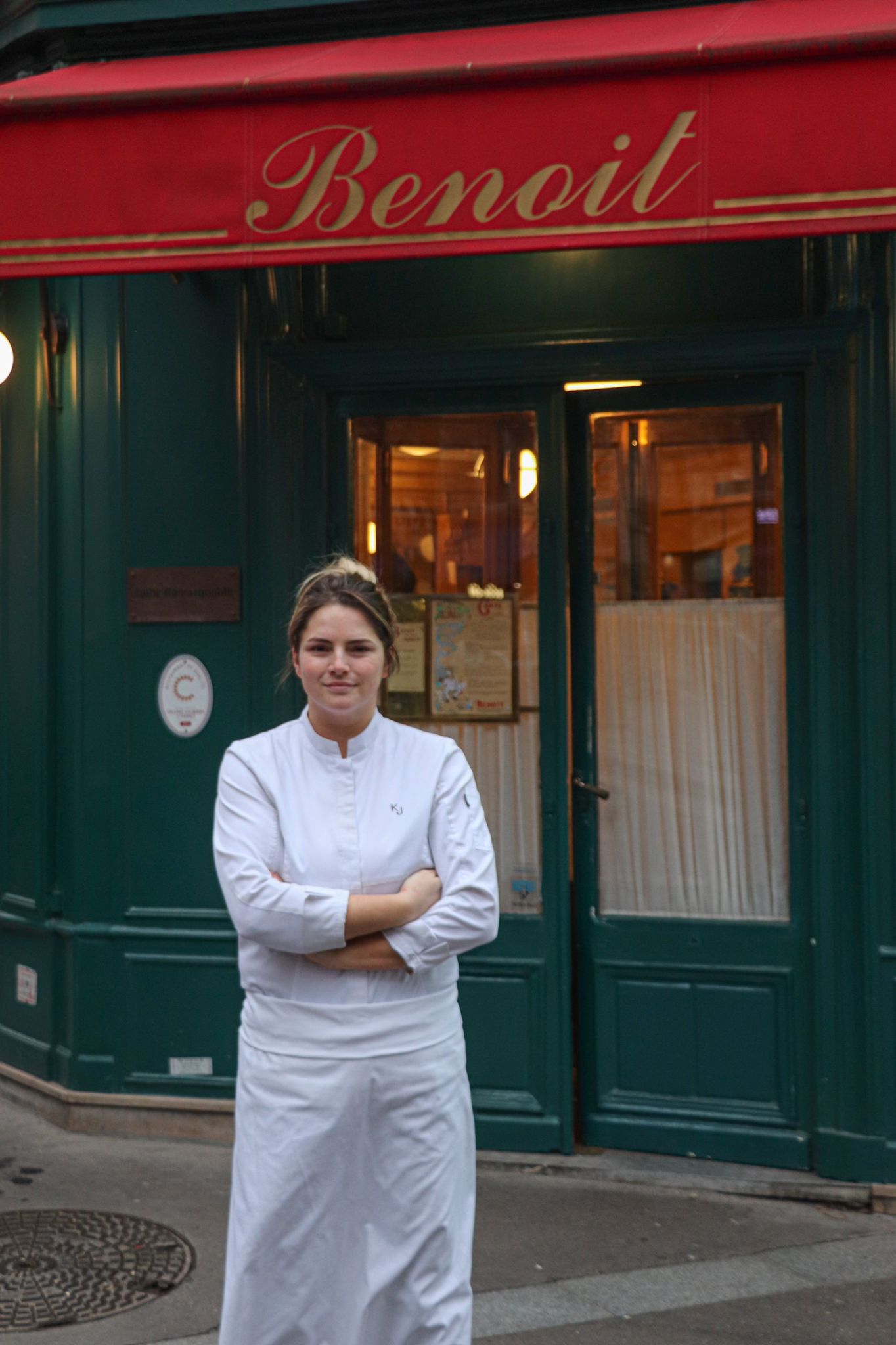 Elle a fait toute sa jeune carrière dans le groupe Ducasse, commise au Louis XV à Monaco, sous-cheffe au Mix à Dubaï, cheffe formatrice à l’Ecole Ducasse à Meudon, enfin sous-cheffe sur le bateau du maestro AD, Ducasse-sur-Seine, sans oublier un passage au Parc des Eaux Vives à Genève. Kelly Jolivet, savoyarde, 28 ans tout juste, formée à l’école hôtelière de Thonon-les-Bains, prend la succession de Fabienne Eymard, partie pour mener à bien un projet personnel. Elle remplace la cheffe de Benoît rue Saint-Martin, à deux pas de l’hôtel de ville de Paris. Sa mission ? Prolonger la belle destinée de ce bistrot étoilé, le seul de son registre dans la capitale, ouvert tous les jours, et qui propose une cuisine bourgeoise à la parisienne, depuis 1912, qu’Alain Ducasse racheta jadis à la famille Petit sans jamais le faire dévier de sa belle destinée. Pâté en croûte, escargots en coquille, tête de veau en cocotte et sauté d’abats nobles font partie des plats stars de la maison.