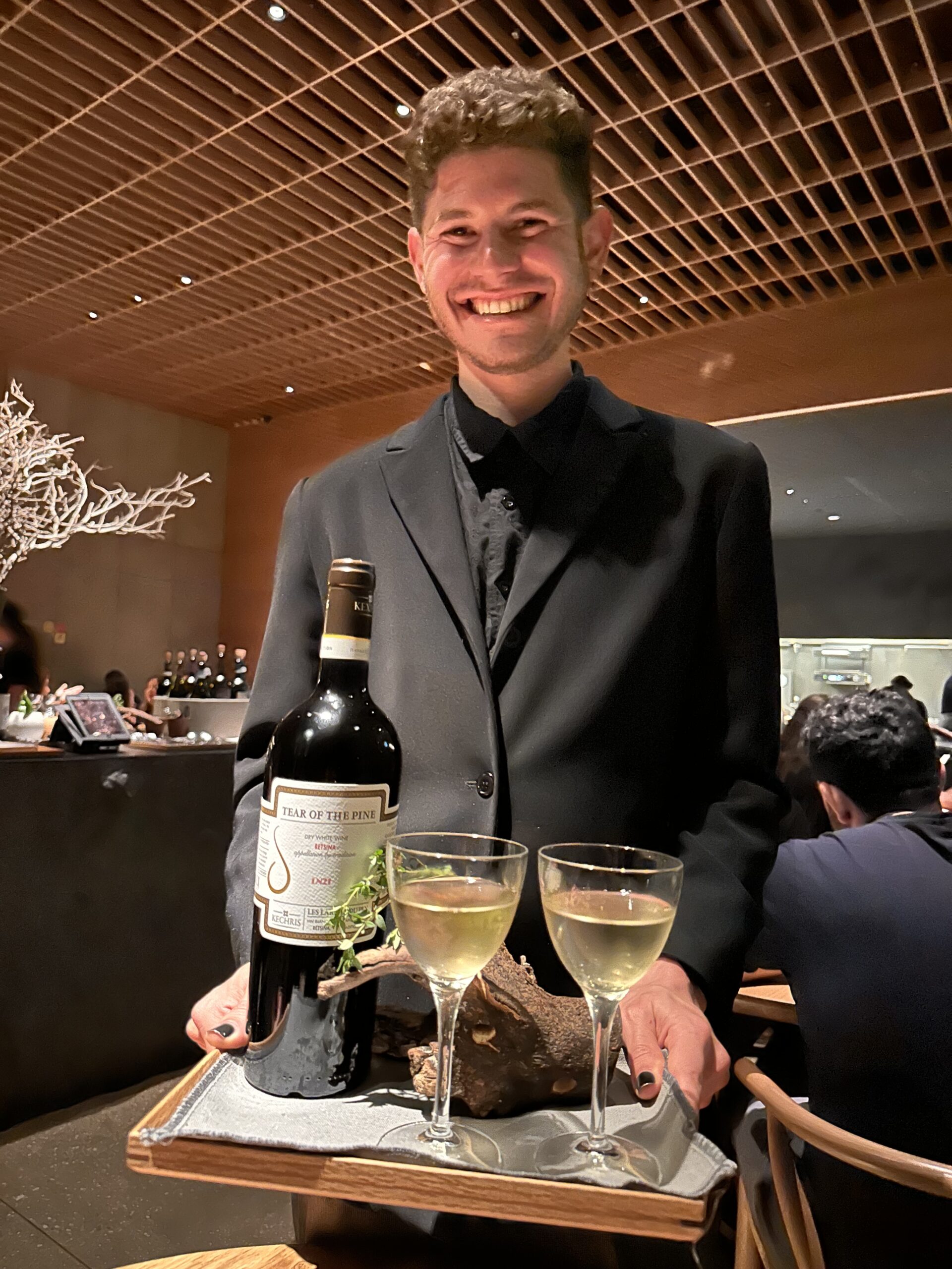 Les « vrais plats »? Le sashimi de hamachi, feuille de raifort, confiture de ponzu, kiwi, caviar osciètre du kibboutz Dan. Et encore ce morceau de bravoure que constitue la pomme de terre, en pulpe et émulsion, avec tomme de chèvre, vinaigre de pelure de pomme de terre qui réalise un accord superbe avec le savagnin de l’Etoile du domaine Monbourgeau dans le Jura, si joliment noiseté. Mais, avant cela, on aura goûté, côté vins au verre, le blanc de blancs 2010 en chardonnay Katzrin tardivement dégorgé de Yarden, la retsina de Thessalonique « Les larmes du pin » Kalochori ou le riesling sarrois de Scharzhofberger 2018, histoire d’accomplir un tour du monde instructif et vineux.