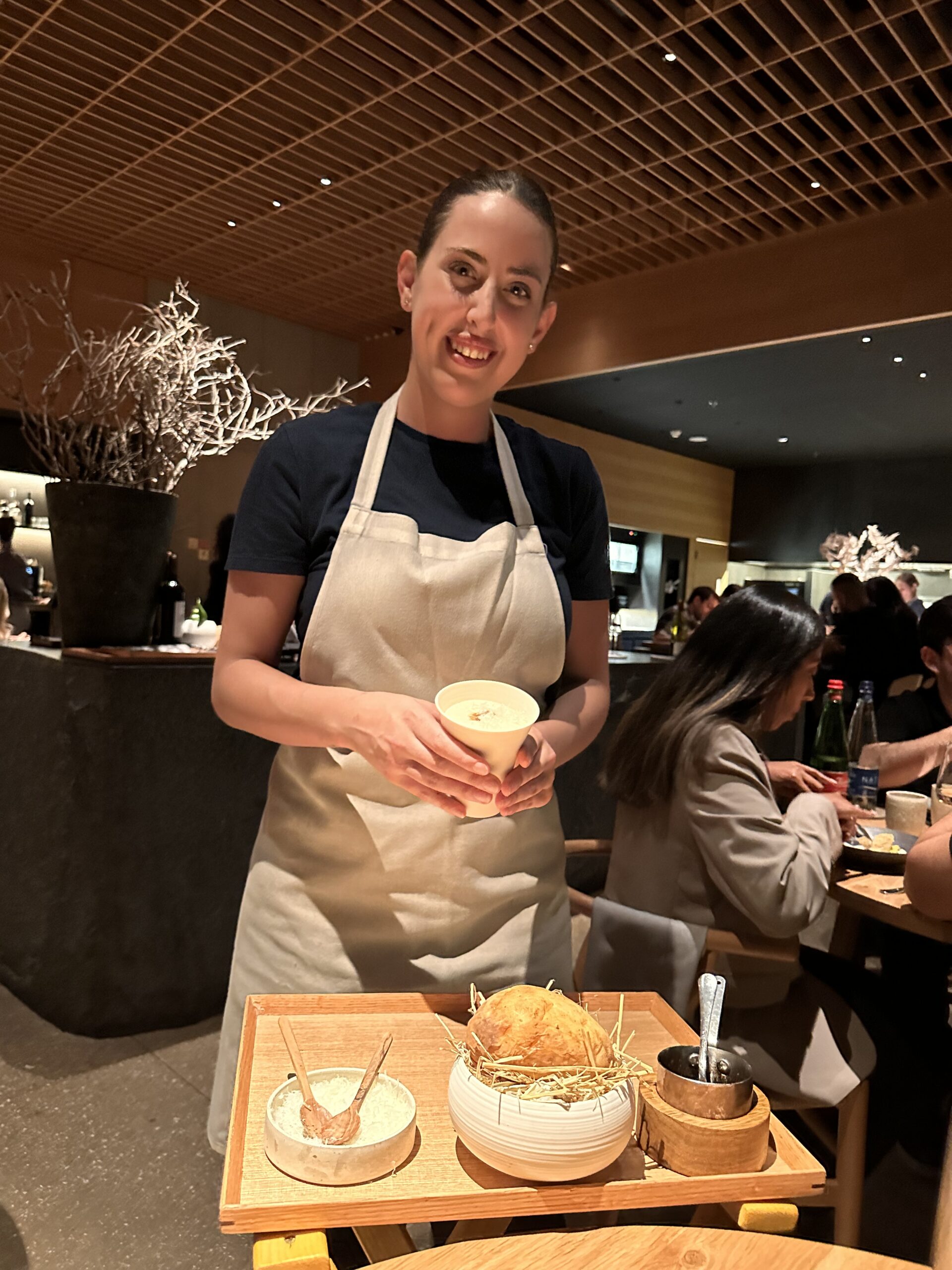 Des clins d’oeil au Proche-Orient en général, à la Galilée, comme comme aux collines de Jérusalem et à la Cisjordanie proche? Il y a de ça dans cette cuisine d’ouverture, à la fois franco-levantine et enracinée ici même. On est accueilli ainsi par un taco épicé avec artichaut en tapenade et chèvre (de la laiterie de Shirat Roïm au Kibboutz Lotem). On débute par un rafraichissant chou rave évidé avec crème fraîche, huîtres et granité de chou rave. On picore ensuite les divins amuse-gueule composés de crakers aux graines de potiron, citron et coriandre, tartelette au poireau, ail fermenté et ris de veau et encore superbe brioche caramélisée aux anchois, avec tartare de crevettes et – rare et exquis – lard d’agneau.