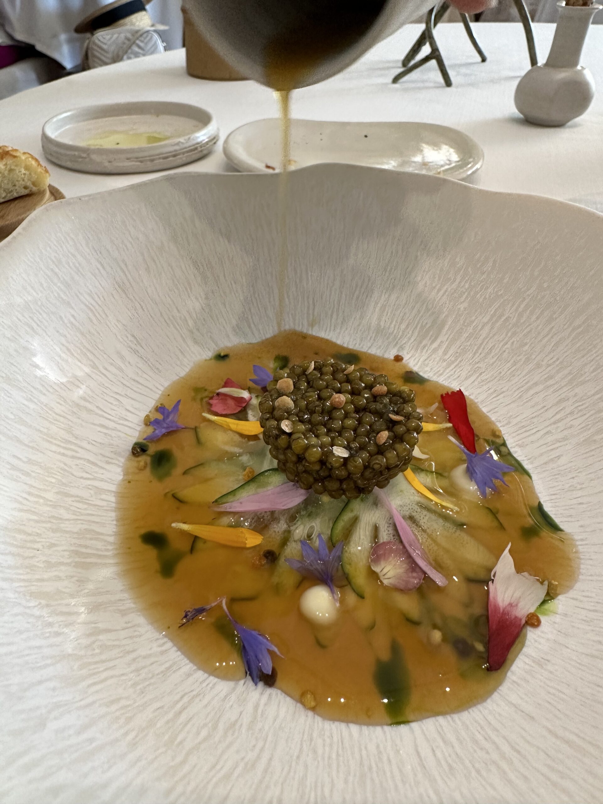 Le service des fromages donne place aux chèvres du pays, les vins jouent le grand air du grand Sud, comme de la vallée du Rhône, mais pas seulement : blanc de Corse ‘’Biginti’’ 2018 Domaine Buzzo, champagne Brut Nature de la Maison Drappier dans l’Aube pour le caviar et les légumes en fleur, le blanc IGP Bouches du Rhône 2020 Villa Minna, celui de Bandol ‘’Estagnol’’ 2016 de La Bastide Blanche ou le rouge IGP des collines rhodaniennes ‘’Kamaka’’ 2020 Greame et Julie Bott sur le terroir de Seyssuel.