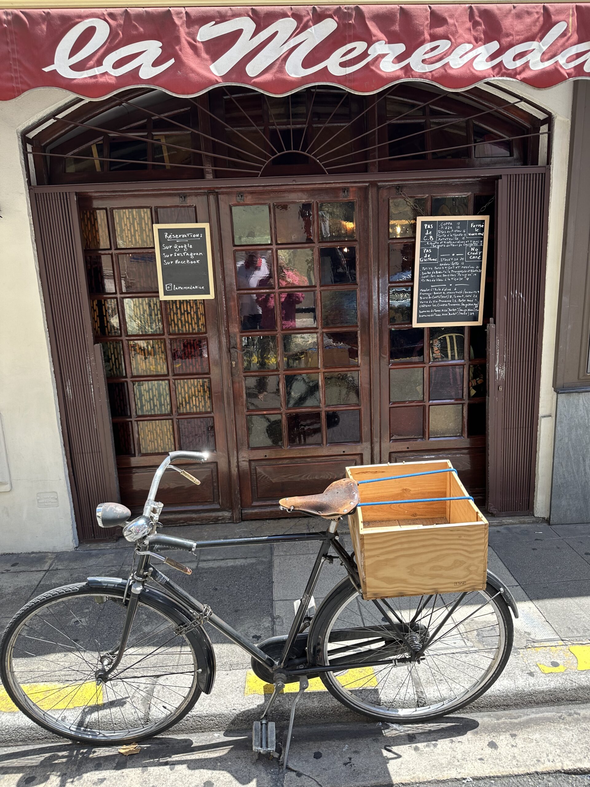 Il y a le cadre rustique, les tabourets, l’ardoise changeante, les rideaux en colliers de perle, mais aussi les serviettes en tissu, le service renouvelé et rajeuni, prompt et motivé, les propositions changeantes, les idées nissardes de toujours et du goût du jour, le rosé du Moulin des Crostes ou celui de Toasc en Bellet, plus l’absence de réservation, de téléphone et de cartes de crédit, qu’imposèrent là, jadis, les Giusti. Formule que reprit Dominique le Stanc, ancien de Chapel à Mionnay (dont la photo figure ici encadrée), de l’Auberge de l’Ill à Illhausern, du Cerf à Marlenheim (où il rencontra son épouse Danièle Husser), de Gaston Lenôtre au Pré Catelan et d’Alain Senderens à l’Archestrate – qui le nomma « Jésus ».