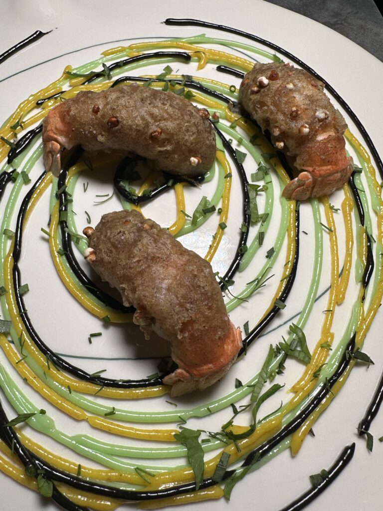 Et l’on passe aux choses sérieuses avec les coquillages aux inspirations bretonnes (saint jacques et moules), melba croustillante de sarrasin, la truffe melano et topinambour servie dans sa coupe mousseuse flanquée de sa brioche maison, langoustines en tempura de sarrasin, avec son medley de sauces genre mayo à l’encre et crustacé, mais aussi le rouget de petit bateau, présenté comme un gâteau roulé, avec panais, arabica et sauce espagnole.